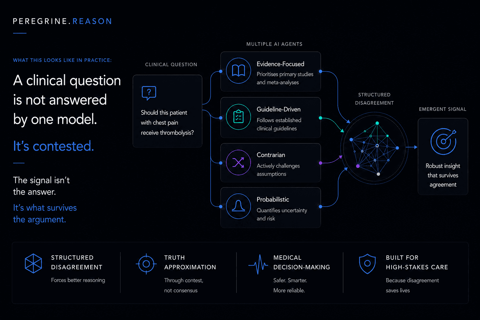 A moderator evaluates competing arguments. The system produces a structured synthesis for clinician review.